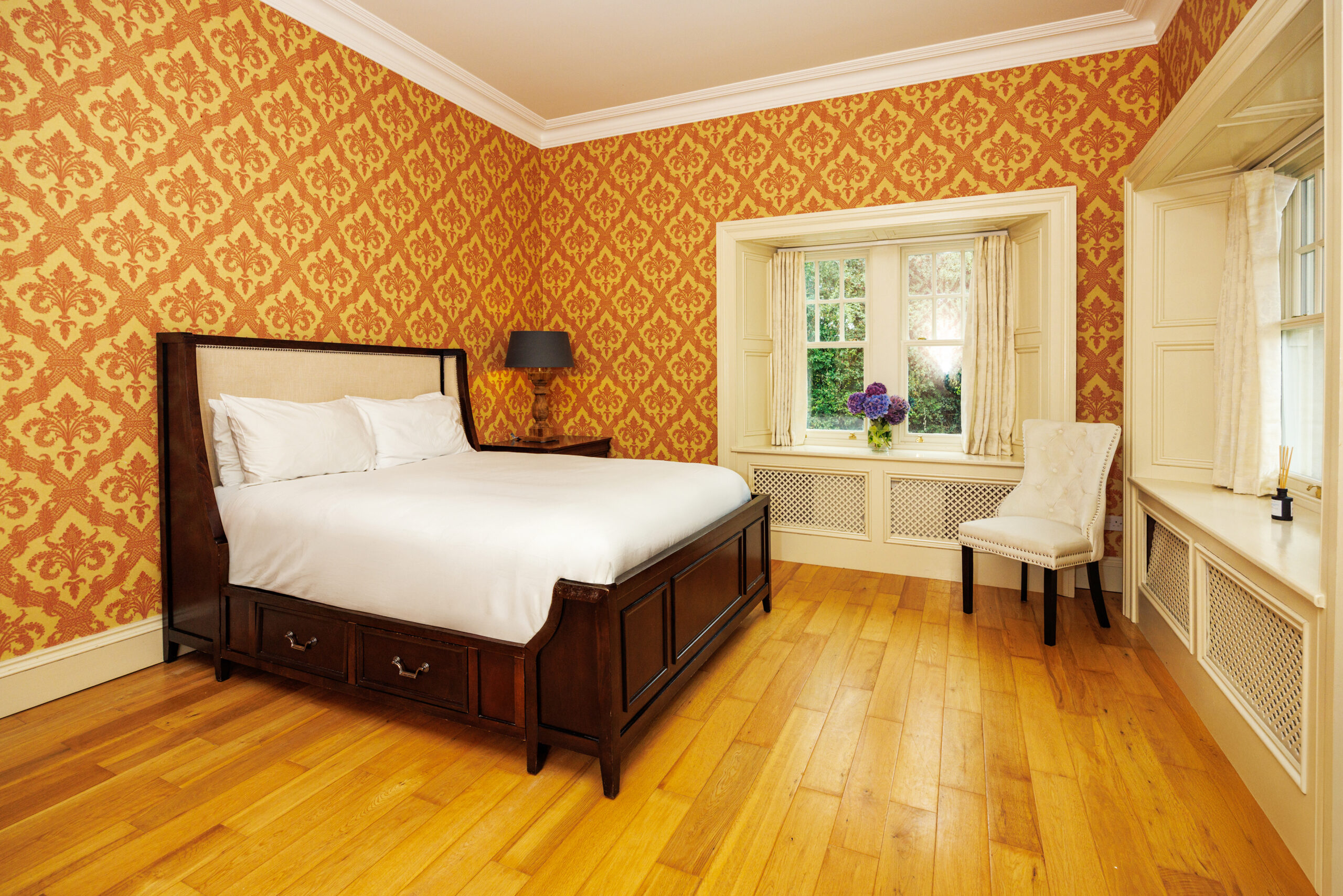 Unwind in the Rosewood Chamber's timeless elegance. The room features golden damask walls, a plush queen-sized bed, and polished wooden floors. Sunlight pours through large windows, offering garden views and a peaceful ambience. This suite blends classic luxury with modern comforts, creating an enchanting haven. Discover the timeless beauty of exclusive suites in Limerick like the Rosewood Chamber.