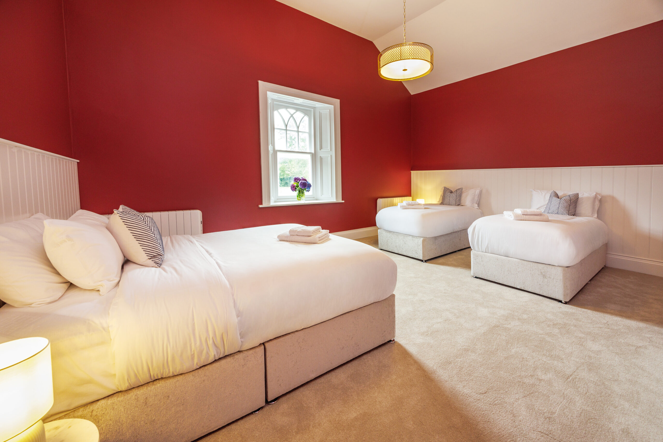 Designed with comfort and connection in mind, the Family Room offers a warm and inviting space perfect for groups or those travelling with children. Featuring a generous layout with two plush double beds, artful décor, and cosy textiles, this room is ideal for unwinding after a day of celebration or exploration. Soft natural light highlights the room’s relaxed aesthetic, creating a comforting retreat where shared moments and restful nights come naturally. Experience the joy of togetherness in one of Sallymount House’s most versatile rooms.
